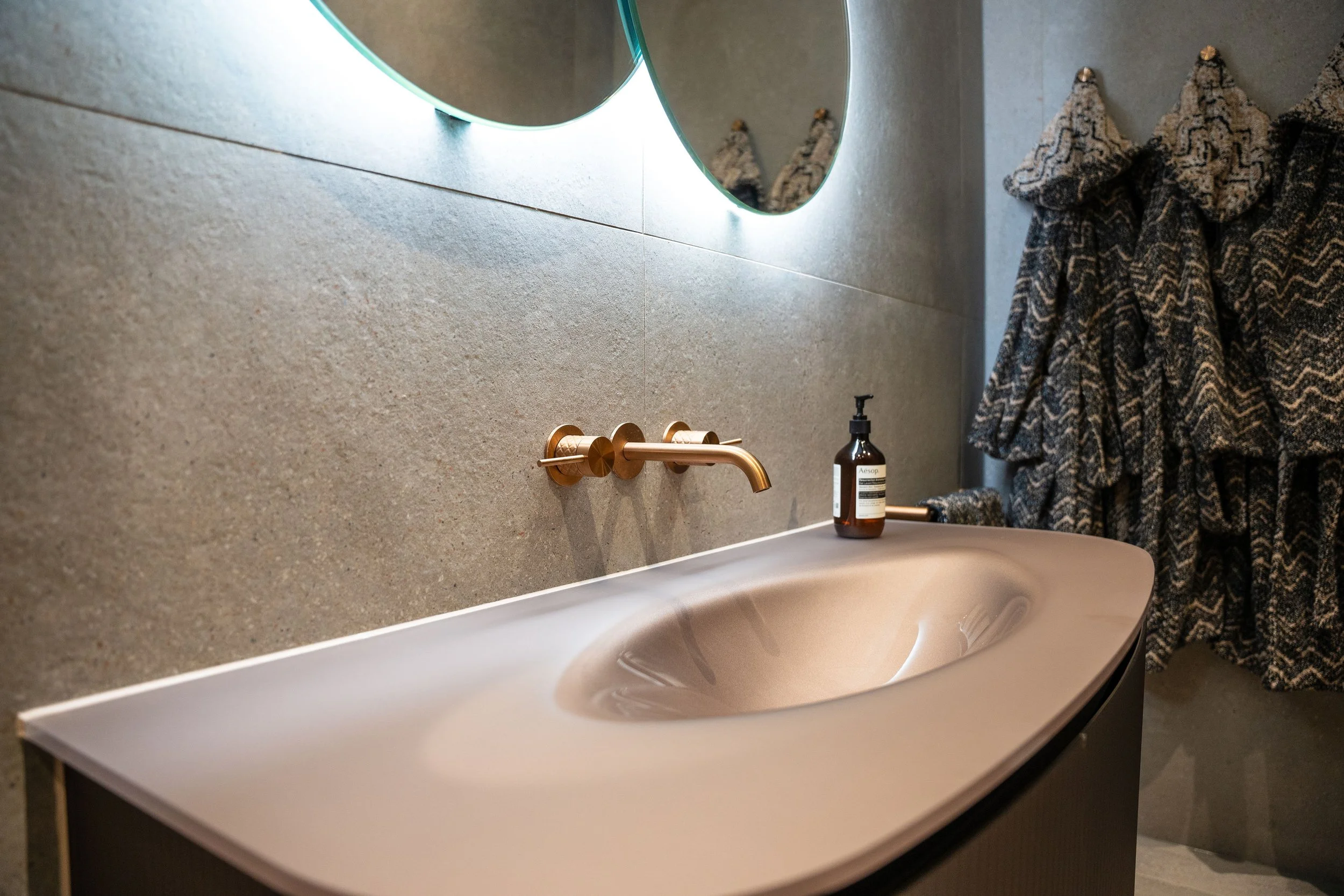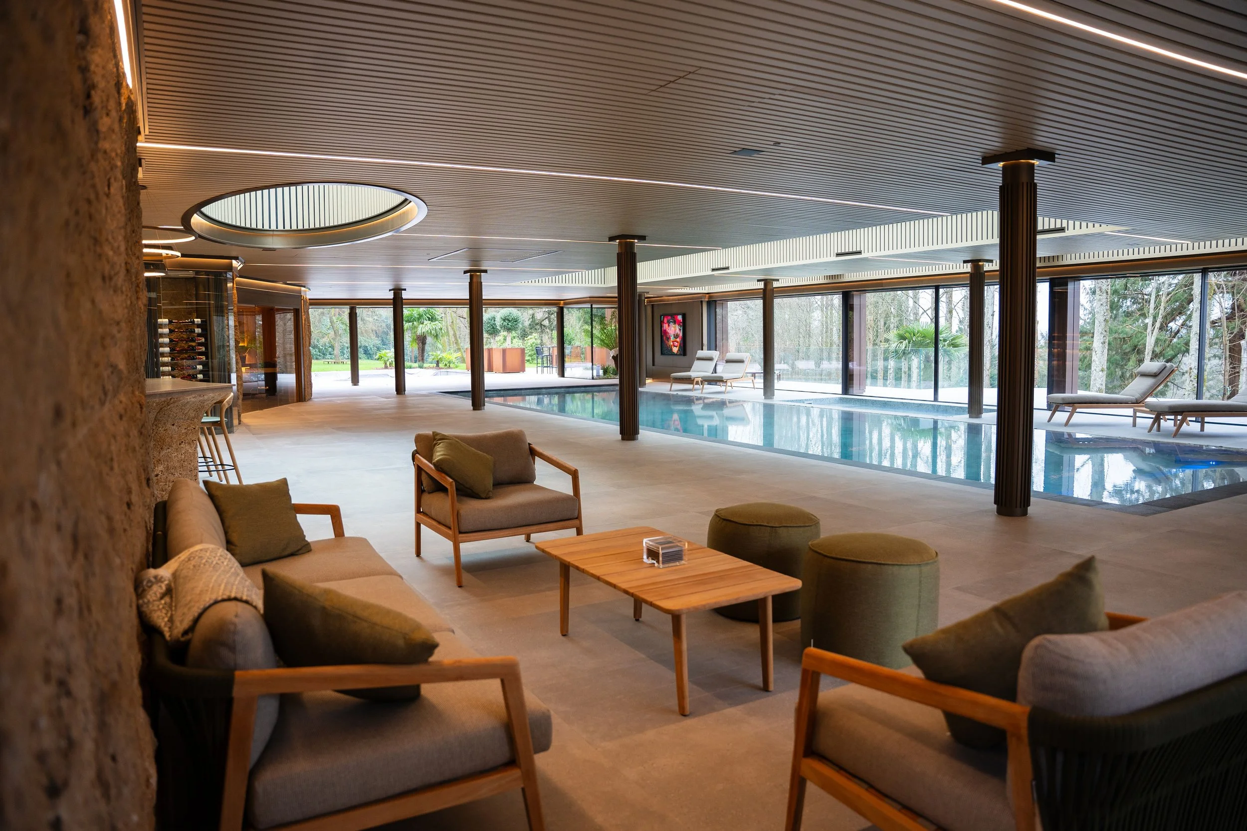 The centrepiece is a state-of-the-art glazing system, allowing the entire perimeter to slide open in the summer months so the pool connects seamlessly with the surrounding landscape. In the winter, the same space transforms into an intimate indoor spa — warm, inviting, and filled with natural light.